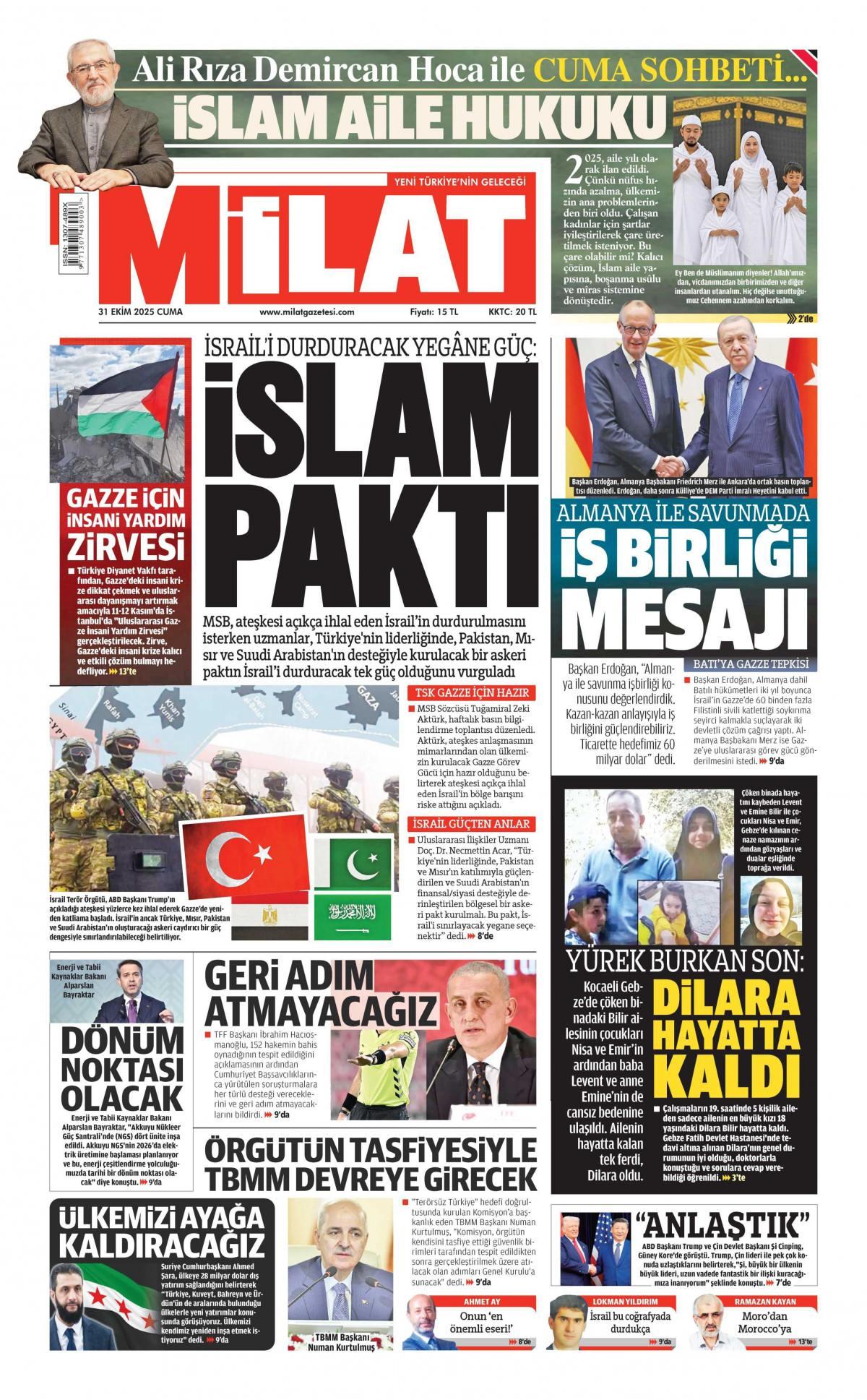 Milat Gazetesi 31 Ekim 2025, Cuma Günü Manşeti