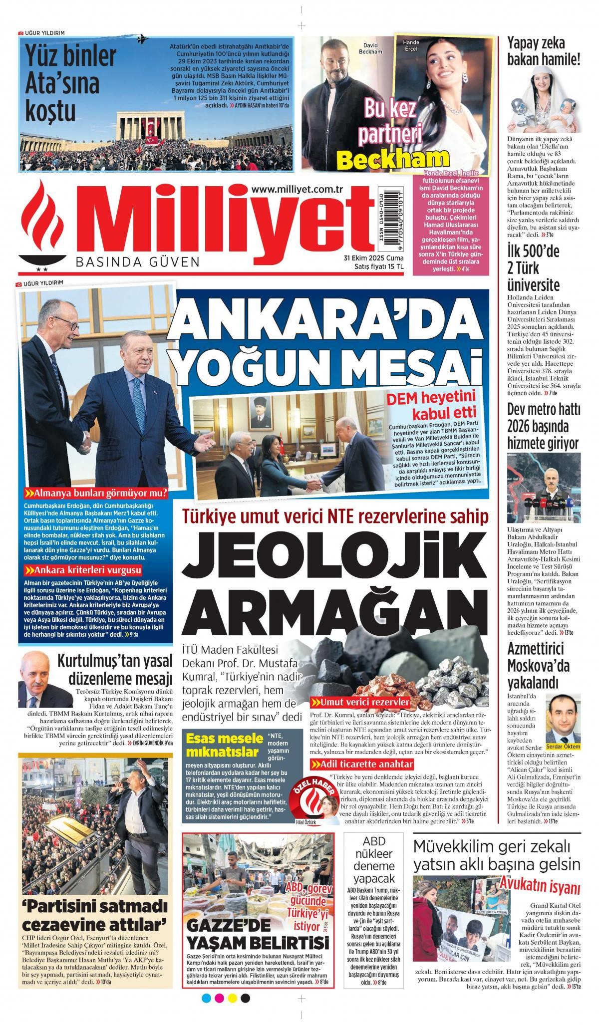 Milliyet Gazetesi 31 Ekim 2025, Cuma Günü Manşeti
