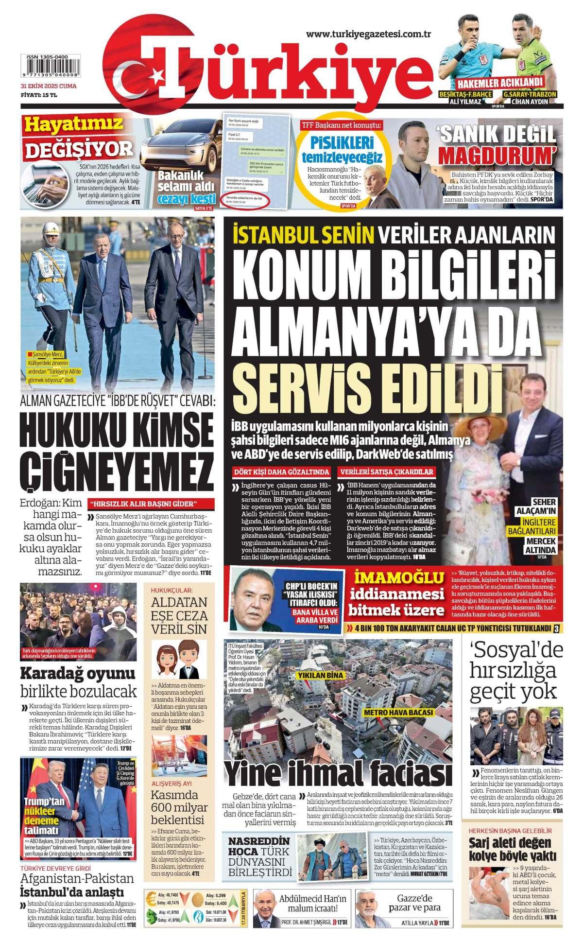 Türkiye Gazetesi 31 Ekim 2025, Cuma Günü Manşeti