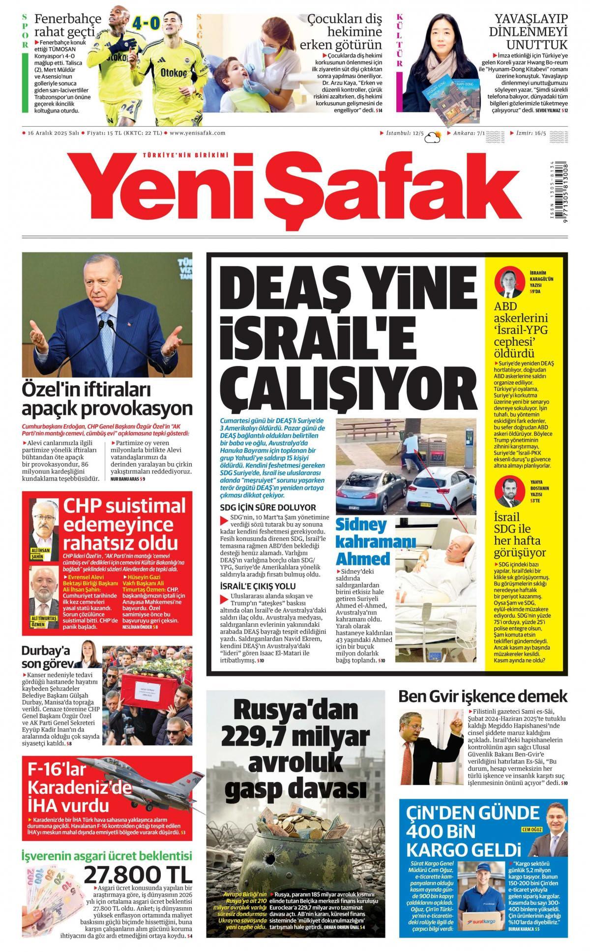 Yeni Şafak Gazetesi 16 Aralık 2025, Salı Günü Manşeti